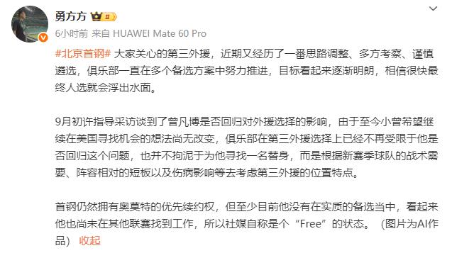 另外勇方方还谈到了北京男篮上个赛季的锋线外援,因为如果曾凡博不回来的话,北京男篮基本上就会选择一名锋线外援,很多球迷都会想到上个赛季在球队效力的奥莫特。不过据勇方方透露,北京男篮虽然对奥莫特使用了优先续约权,奥莫特至今还没有签约,但他并不在北京男篮的备选中。也就是说,北京男篮已经确定不会再和奥莫特续约。这样来看的话,北京男篮在外援选择方面应该是已经有了更加合适的人选。整体来看的话,虽然曾凡博无法回归肯定会给北京男篮的实力造成一些影响,不过球队的整体实力不错,特别是在今年夏天引入了赵睿后,整体实力又有了提升,新赛季的表现还是非常值得期待的,依旧是夺冠的大热门!