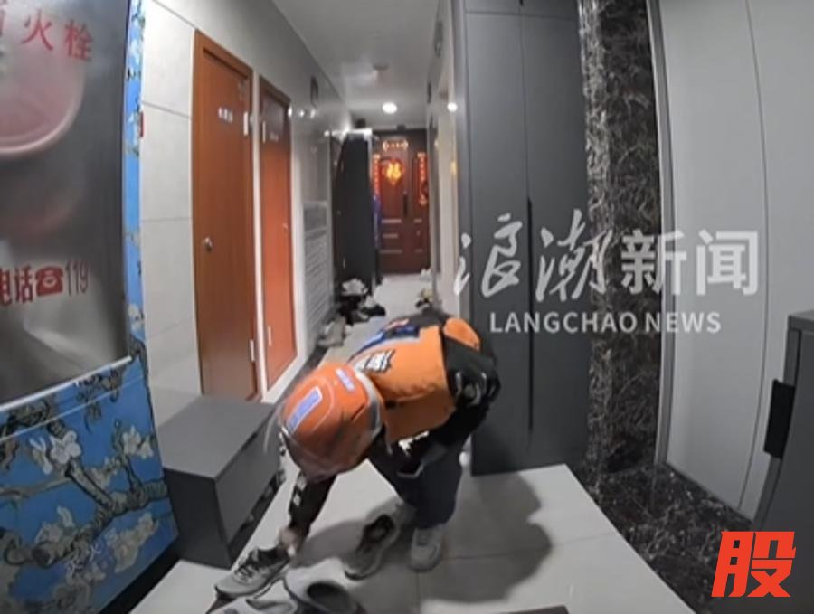 监控画面显示,这名外卖员身着淘宝闪购服装,在等电梯时注意到这双新鞋,随后四下张望,疑似查看周边是否有摄像头。接着他蹲下直接换上新鞋,拎起旧鞋后通过消防楼梯离开现场。